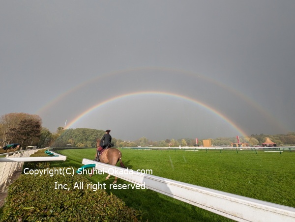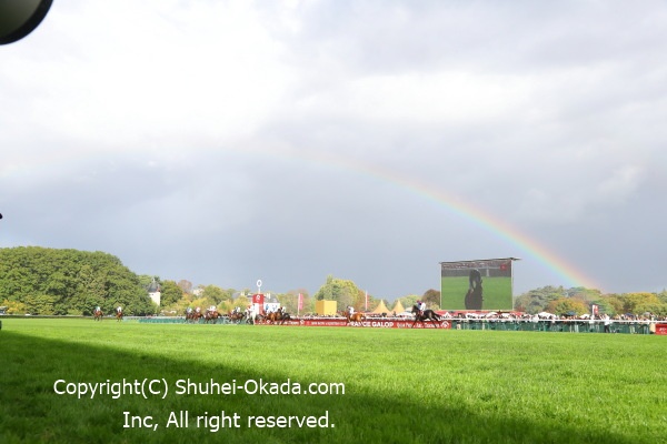 7Rレースのロワイヤリュー賞(芝2800m G1)直後に黒い雲に覆われて夕立が降った、8レースの始まる直前に晴れ間がのぞいて1コーナー側に綺麗なダブルレインボーが出た♪