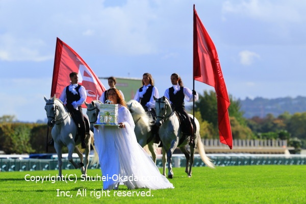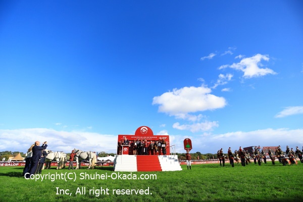 凱旋門賞の出走パレード、本馬場入場を隊列で歩きながらの馬場入り時にポツリポツリと降り出した。