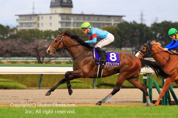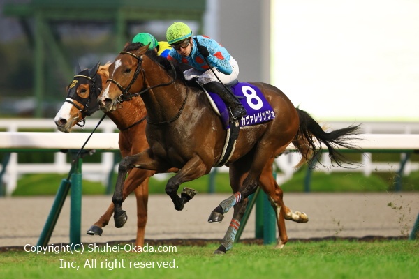 絶妙のペースで逃げ切りを計るが、中団待機のC.デムーロ騎乗のカヴァレリッツォが一完歩づつ伸びる。