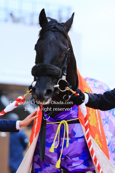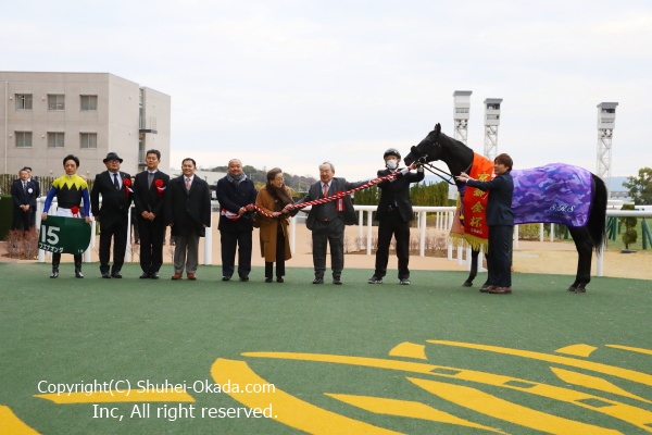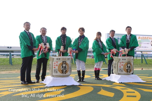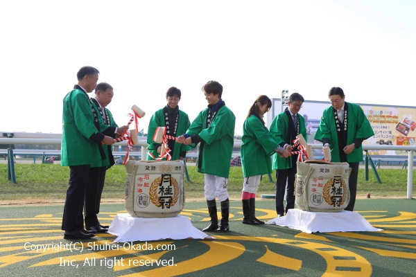 1レース前のウイナーズサークルで鏡開きが行われ、騎手会長の武豊騎手。