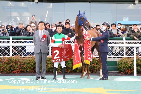 西塚洸二騎乗のギリーズボールが差し切り勝ち、大混戦の2着争いは外から脚を伸ばしたサンアントワーヌがハナ差、差しており。