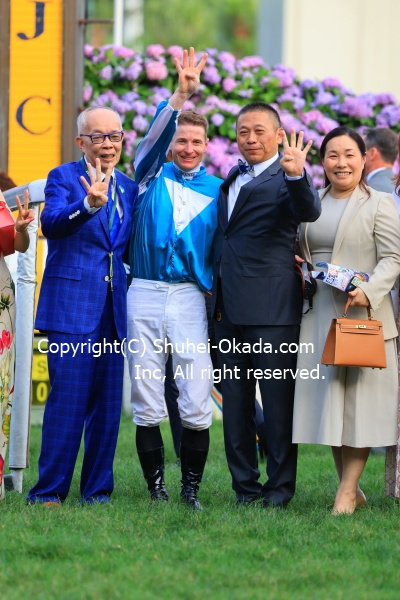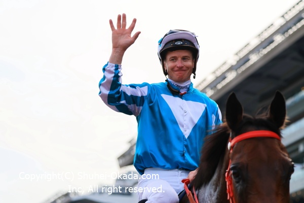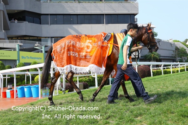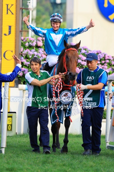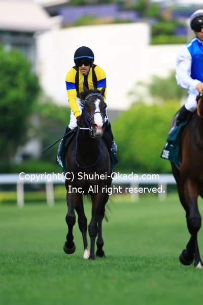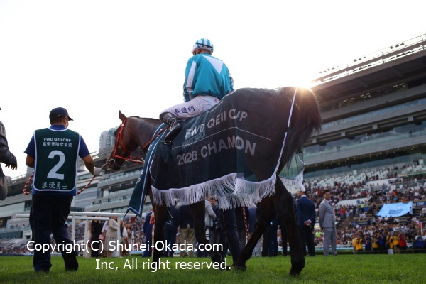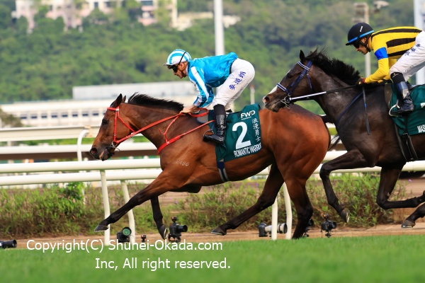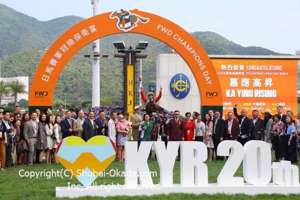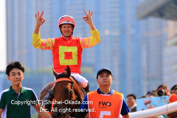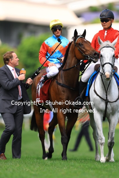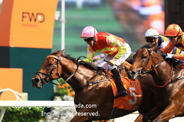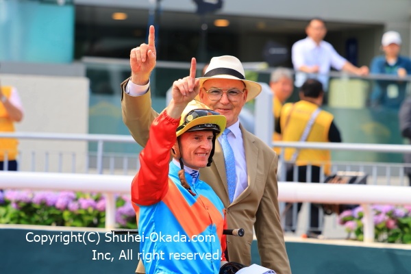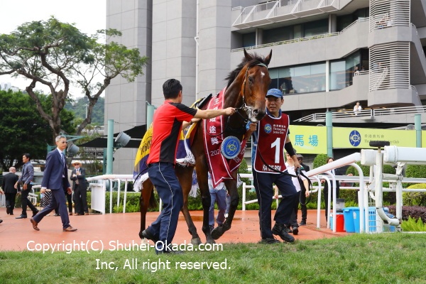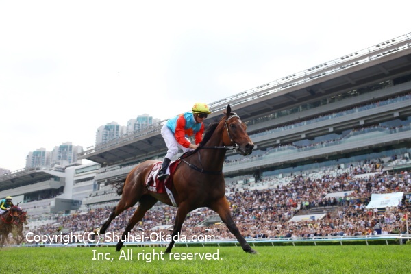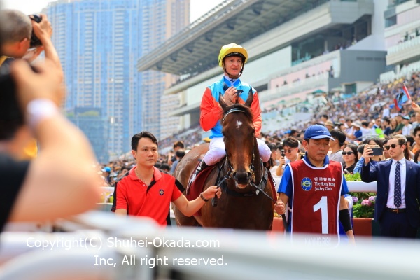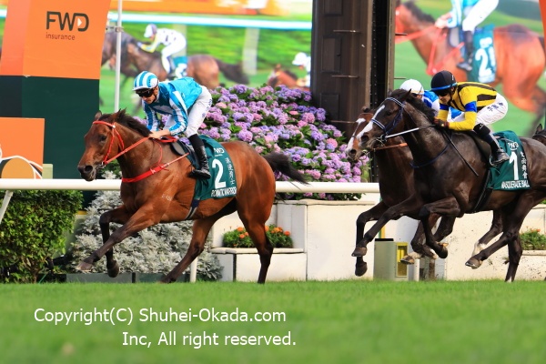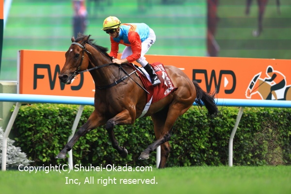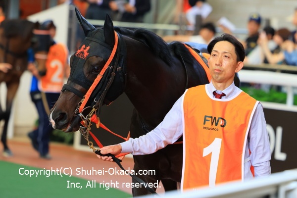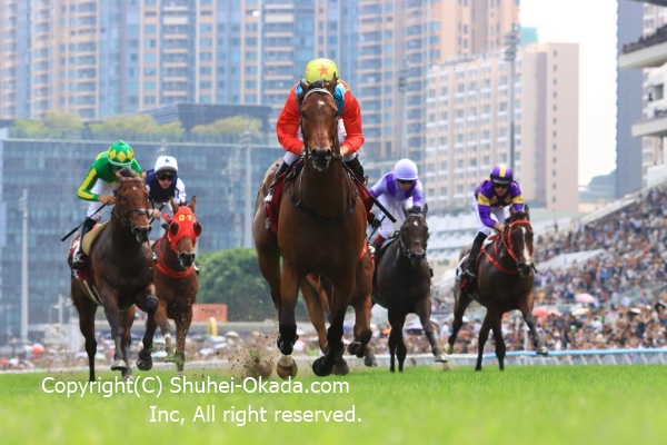 このレースで20連勝がかかるパートン騎乗の香港のエース、カーインライジングが単勝1.0倍に応えて快勝。